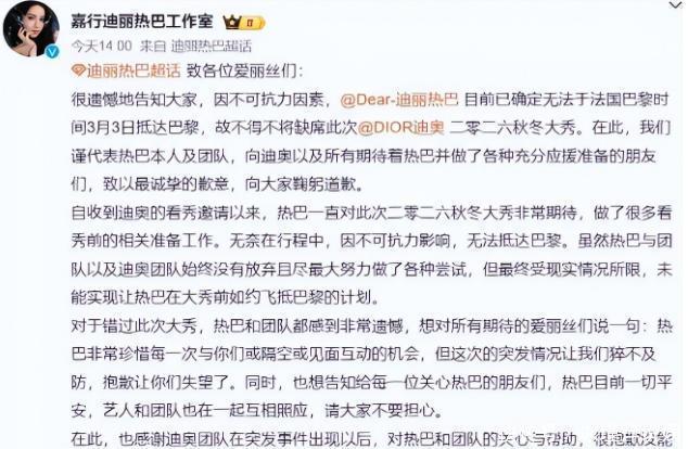 2月26日,迪丽热巴和嘉行传媒的十年合约到期,但到了3月3日,她原本准备在巴黎时装周亮相,却突然被曝出滞留在迪拜机场。搞不懂的是,其他同行的员工都能直飞,而她和宣传助理却被安排了必须转机的航线。