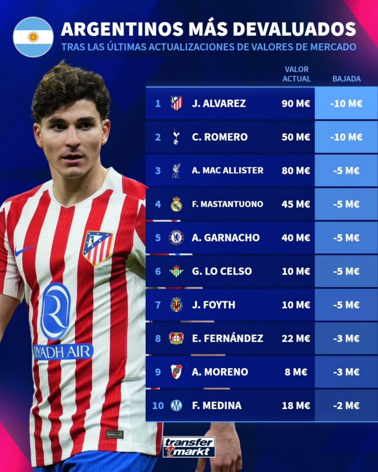 4月17日讯 德国转会市场更新了球员的身价,列出了阿根廷球员身价下跌榜,阿尔瓦雷斯、罗梅罗下跌1000万欧最多。