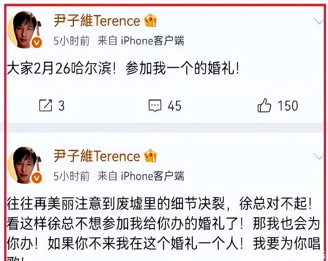2024 年 2 月,徐冬冬与尹子维正式订婚,并对外宣布将在哈尔滨举办一场 “不收礼金、回归纯粹” 的婚礼,引发广泛关注。然而,距离婚礼仅剩数月,10 月 28 日凌晨,尹子维突然在社交平台发布长文道歉,字里行间充满焦灼与不舍:“徐总不想参加婚礼了!那我也会为你办!如果你不来,我在这个婚礼一个人!我要为你唱歌”。这番深夜告白式的道歉迅速引爆热搜,网友对此看法不一,有人心疼尹子维的深情,也有人吐槽两人 “炒作成瘾”,截至目前,徐冬冬方面尚未作出公开回应,这场持续五年的感情拉锯战仍在继续。