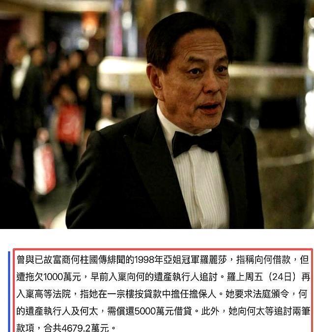 何国柱遗产纠纷:前亚姐追债 4679 万,离世富豪身后风波不断香港百亿富豪何国柱离世三个月后,其生前情感与财务纠纷浮出水面。10 月 28 日,港媒曝出 56 岁的前亚姐冠军罗丽莎,正向何国柱的遗孀追讨两笔合计高达 4679.2 万元的债务,引发舆论哗然。何国柱出身名门,作为香港烟草集团的后人,不仅家境优渥,外形也英俊潇洒,年轻时便是香港社交圈的风云人物,绯闻轶事从未间断。